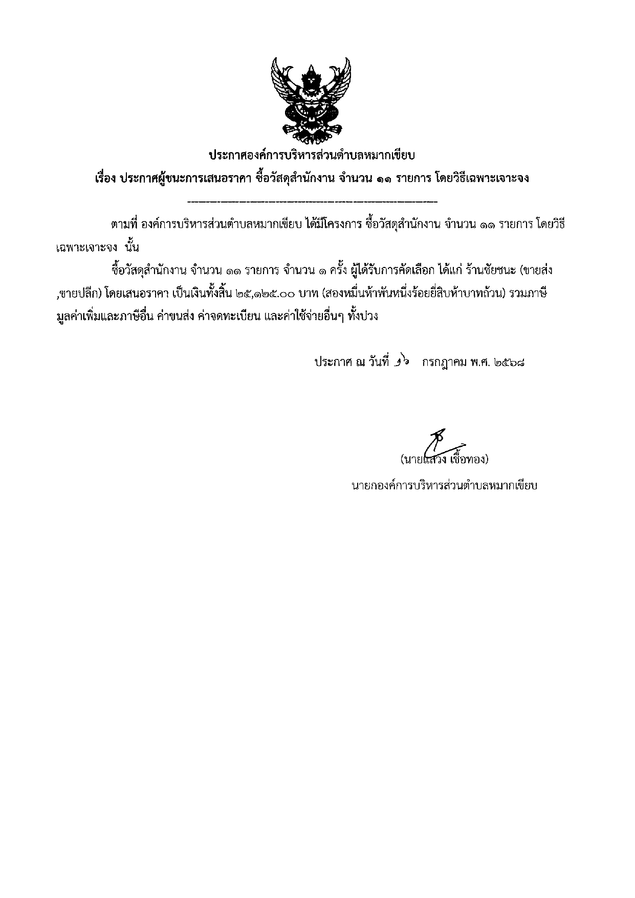 ประกาศ อบต.หมากเขียบ เรื่อง ประกาศผู้ชนะการเสนอราคา ซื้อวัสดุสำนักงาน จำนวน 11 รายการ โดยวิธีเฉพาะเจาะจง 16 กรกฎาคม 202529 กรกฎาคม 2025องค์การบริหารส่วนตำบลหมากเขียบ จังหวัดศรีสะเกษประกาศผล