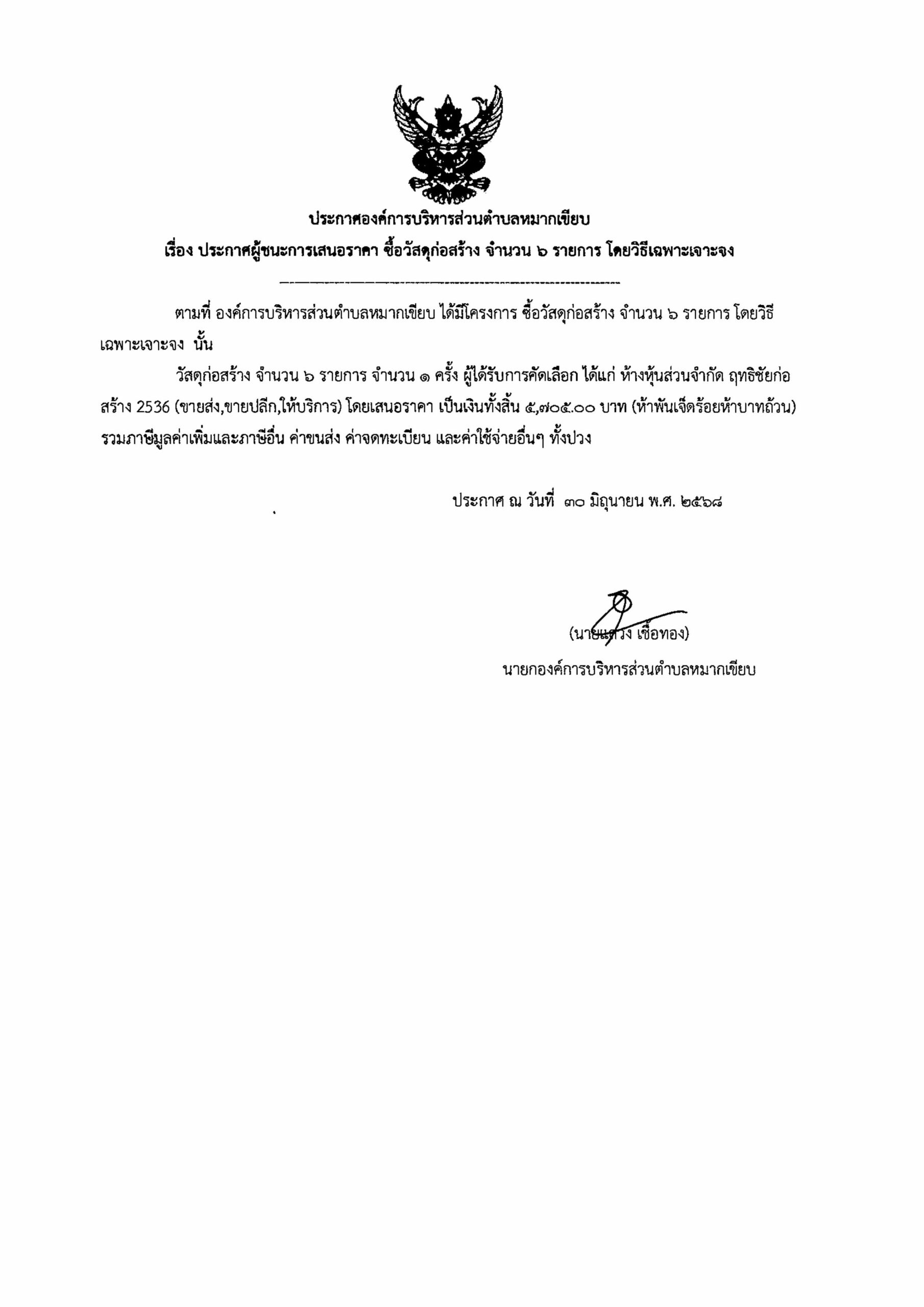 ประกาศ อบต.หมากเขียบ เรื่อง ประกาศผู้ชนะการเสนอราคา ซื้อวัสดุก่อสร้าง จำนวนน 6 รายการ โดยวิธีเฉพาะเจาะจง 29 กรกฎาคม 2025องค์การบริหารส่วนตำบลหมากเขียบ จังหวัดศรีสะเกษประกาศผล