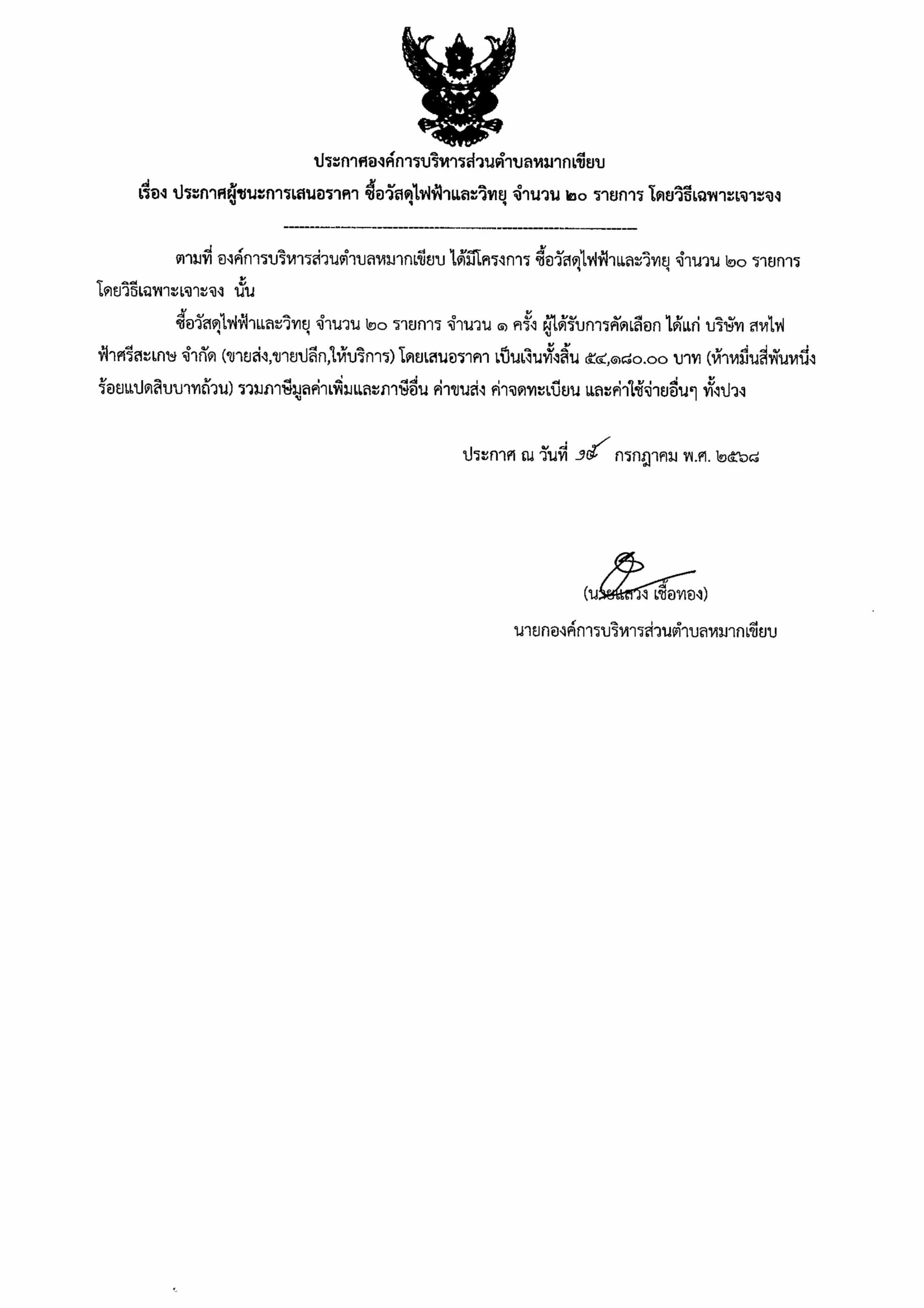 ประกาศ อบต.หมากเขียบ เรื่อง ประกาศผู้ชนะการเสนอราคา ซื้อวัสดุไฟฟ้าและวิทยุ จำนวน 20 รายการ โดยวิธีเฉพาะเจาะจง