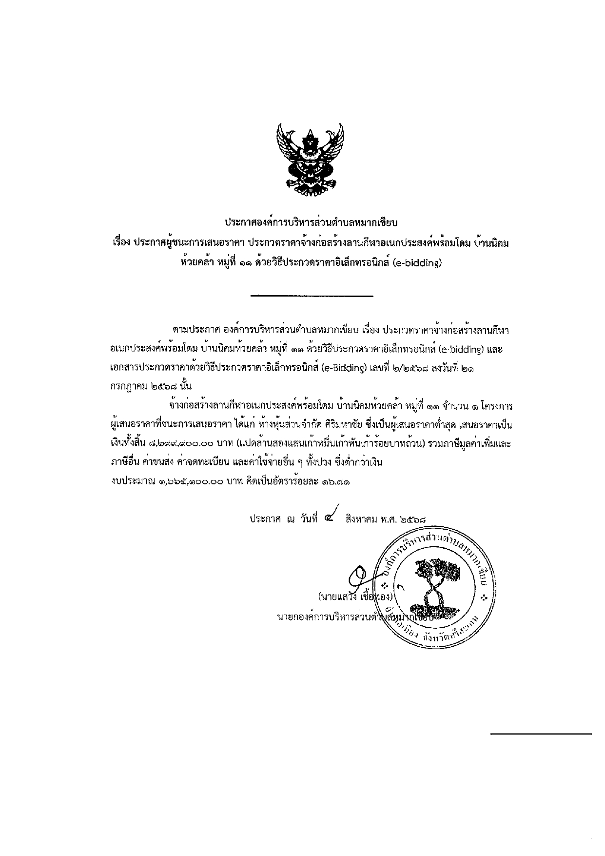 ประกาศ อบต.หมากเขียบ เรื่อง ประกาศผู้ชนะการเสนอราคา ประกวดราคาจ้างก่อสร้างลานกีฬาอเนกประสงค์พร้อมโดม บ้านนิคมห้วยคล้า หมู่ที่ 11 ด้วยวิธีประกวดราคาอิเล็กทรอนิกส์ (e-bidding) 4 สิงหาคม 2025องค์การบริหารส่วนตำบลหมากเขียบ จังหวัดศรีสะเกษประกาศผล