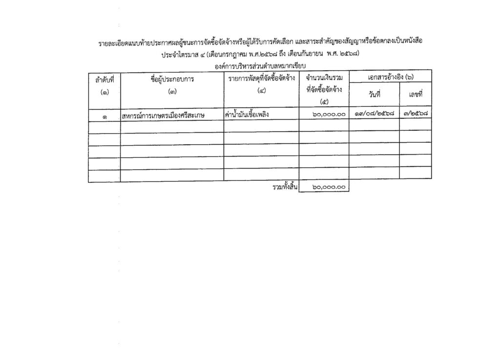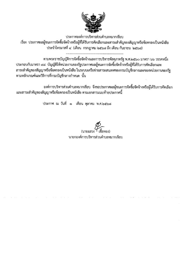 ประกาศ อบต.หมากเขียบ เรื่อง ประกาศผู้ชนะการจัดซื้อจัดจ้างหรือผู้ที่ได้รับการคัดเลือกและสาระสำคัญของสัญญาหรือข้อตกลงเป็นหนังสือ ประจำไตรมาสที่ 4 (เดือนกรกฎาคม 2568 ถึง เดือนกันยายน 2568)