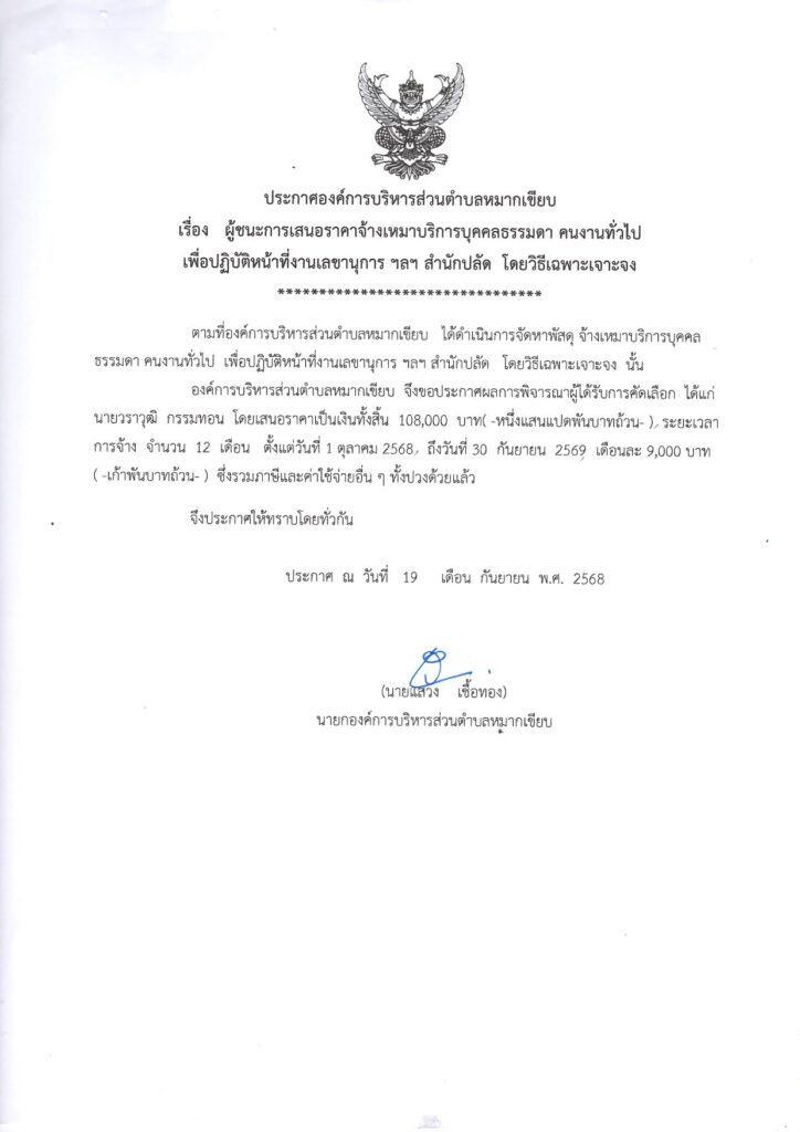 ประกาศ อบต.หมากเขียบ เรื่อง ผู้ชนะการเสนอราคาจ้างเหมาบริการบุคคลธรรมดา คนงานทั่วไป เพื่อปฏิบัติหน้าที่งานเขานุการ ฯลฯ สำนักปลัด โดยวิธีเฉพาะเจาะจง