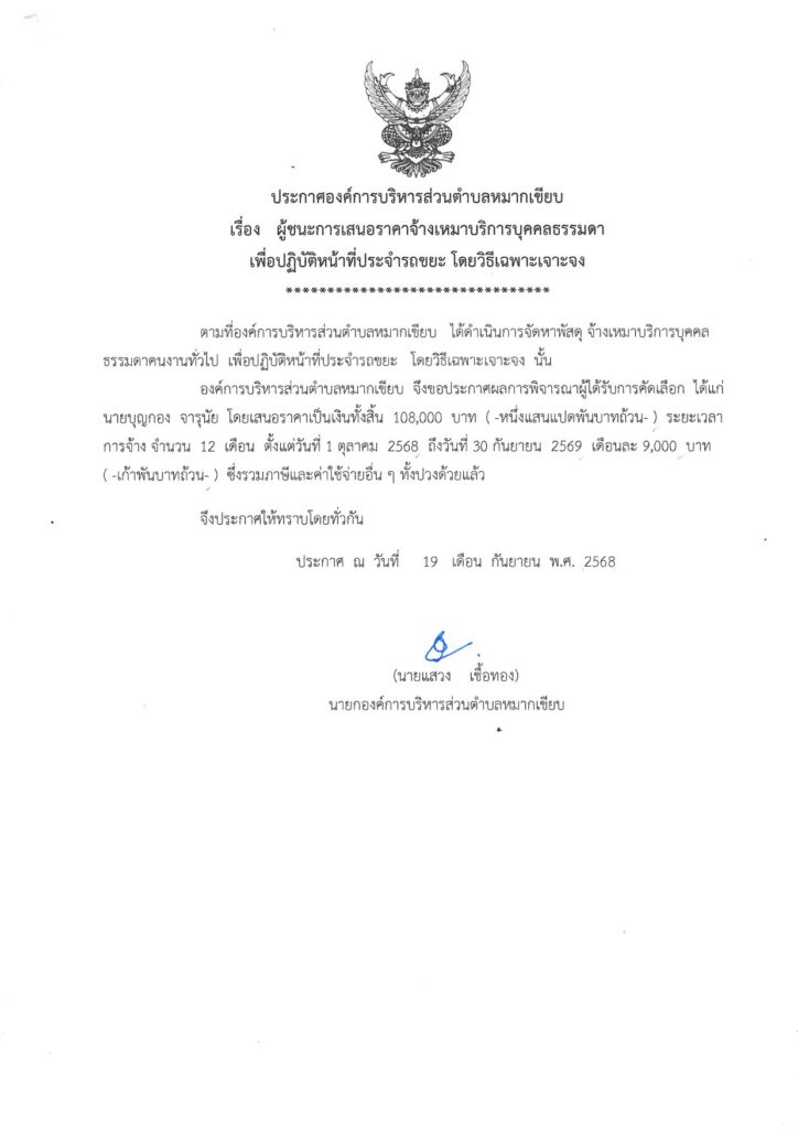 ประกาศ อบต.หมากเขียบ เรื่อง ผู้ชนะการเสนอราคาจ้างเหมาบุคคลธรรมดา เพื่อปฏิบัติหน้าที่ประจำรถขยะ โดยวิธีเฉพาะเจาะจง 24 ตุลาคม 202524 ตุลาคม 2025นายอนุสรณ์ กานกายันต์ประกาศผล