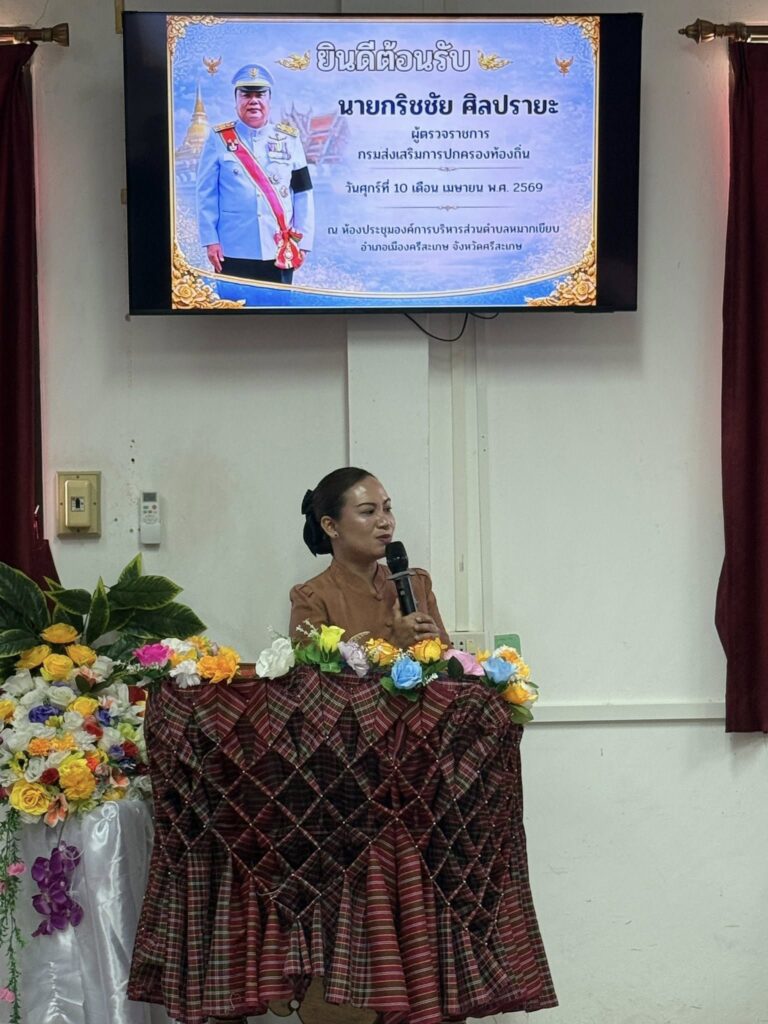 ในวันศุกร์ที่ 10 เมษายน 2569 เวลา 11.00 น. เป็นต้นไป องค์การบริหารส่วนตำบลหมากเขียบ นำโดย นายแสวง เชื้อทอง อบต.หมากเขียบ พร้อมด้วย คณะผู้บริหาร สมาชิกสภาอบต.หมากเขียบ ปลัดอบต.หมากเขียบ หัวหน้าส่วนราชการ พนักงานเจ้าหน้าที่ในสังกัดอบต.หมากเขียบ กำนัน ผู้ใหญ่บ้าน ผู้ช่วยผู้ใหญ่บ้าน ตำบลหมากเขียบ ผู้อำนวยการ รพ.สต.บ้านก้านเหลือง อสม.ตำบลหมากเขียบ พนักงานเจ้าหน้าที่ตำรวจ สภ.เมืองศรีสะเกษ และประชาชนในพื้นที่ ร่วมให้การต้อนรับ นายกริชชัย ศิลปรายะ ผู้ตรวจราชการกรมส่งเสริมการปกครองท้องถิ่น ซึ่งได้มี กำหนดการตรวจราชการในพื้นที่ของจังหวัดศรีสะเกษ ประจําเดือนเมษายน 2569 เพื่อขับเคลื่อนและติดตามภารกิจตามนโยบายของรัฐบาล กระทรวงมหาดไทย และกรมส่งเสริมการปกครองท้องถิ่น รวมทั้งรับฟังปัญหา อุปสรรค และข้อเสนอแนะในการพัฒนางานของกรมส่งเสริม การปกครองท้องถิ่น และองค์กรปกครองส่วนท้องถิ่น ณ ห้องประชุมองค์การบริหารส่วนตำบลหมากเขียบ ในการนี้ได้เข้าเตรวจเยี่ยมและให้ กำลังใจสถานที่ 3 แห่ง ได้แก่ 1.ตรวจเยี่ยมศูนย์พัฒนาเด็กเล็กบ้านก้านเหลือง 2.ตรวจเยี่ยมและให้กำลังใจโครงการดำเนินงานตำบลยั่งยืนเพื่อแก้ไทปัญหายาเสพติดแบบครบวงจรตามยุทธศาสตร์ชาติ ประจำปีงบประมาณ พ.ศ. 2569 สภ.เมืองศรีสะเกษ วัดนิคมศิราลาม บ้านหนองสิม หมู่ที่ 7 ตำบลหมากเขียบ และ3.ตรวจเยี่ยมให้กำลังใจศูนย์ร่วมปฏิบัติการความปลอดภัยทางถนน (ช่วงเทศกาลสงกราต์) ด่านชุมชนปากหวาน บริเวณแยกทางเข้าบ้านก้านเหลืองตะวันออก หมู่ที่ 8 ตำบลหมากเขียบ อำเภอเมืองศรีสะเกษ จังหวัดศรีสะเกษ